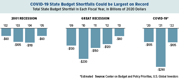 Selon certaines estimations, les États pourraient être confrontés à leur plus grave déficit budgétaire jamais enregistré en raison de la crise COVID-19. Le Center on Budget and Policy Priorities (CBPP), un groupe de réflexion basé à Washington, estime que les États pourraient connaître collectivement un déficit budgétaire de 290 milliards de dollars en 2021, ce qui serait plus important que pendant la récession de 2001 et la crise financière mondiale de 2007-2008.