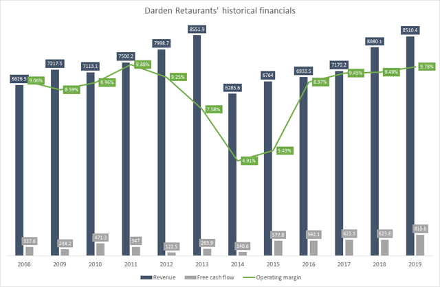 Le restaurant Darden a une très une équipe de gestion compétentequi se manifeste par ses résultats financiers, l’efficacité de son capital et la solidité de son bilan. Darden a considérablement augmenté ses flux de trésorerie au cours des dernières années. En 2019, il a pu générer les mêmes recettes qu’en 2013, qui comprenaient encore l’activité Red Lobster, vendue pour 2,1 milliards de dollars en 2014. Plus important encore, les cash-flows libres atteignent des niveaux records et, même pendant la crise financière de 2008-2010, Darden a réalisé une croissance très stable de ses bénéfices.