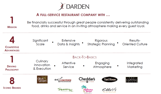 Darden Restaurants est le leader mondial des restaurants à service complet. Il s’agit d’une chaîne qui comprend 8 marques emblématiques : Olive Garden, Longhorn, Cheddar’s, Yard House, The Capital Grille, Seasons 52, Bahama Breeze et Eddie V’s. La société n’est pas vraiment en concurrence directe avec les grandes chaînes de restauration rapide comme McDonald’s (MCD) et Yum ! Brands (YUM), car elle offre une expérience globale de haute qualité à ses clients. L’entreprise opère dans une partie assez restreinte du secteur de la restauration, la restauration décontractée, qui détient 19 % de parts de marché dans le secteur de la restauration. Darden a très bien résisté à la stagnation des ventes de repas décontractés en capturant des parts de marché importantes. En outre, son envergure, la connaissance des données et l’intégration de ses différentes marques lui permettent d’atteindre de fortes marges.