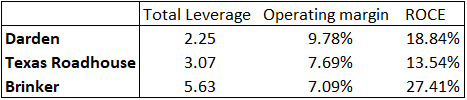 Les mesures de Darden se comparent très favorablement à celles de concurrents comme Texas Roadhouse (TXRH) et Brinker (EAT), comme le montre le tableau ci-dessous. Cela donne à l’entreprise un avantage concurrentiel important.