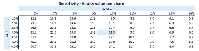 D’après les résultats du compte de profits et pertes, nous prévoyons une forte baisse des recettes pour l’année fiscale 20 et une reprise régulière pour le reste de la période de prévision. Cela ne montre qu’un scénario possible, mais la projection d’un retour aux niveaux de recettes de l’exercice 19 d’ici l’exercice 23 semble raisonnable. L’analyse de sensibilité (veuillez noter que Topgolf est ajouté) ci-dessus montre une valeur calculée d’environ 11 dollars lorsque nous utilisons notre WACC de 10 % et notre taux de croissance terminal de 3 %.