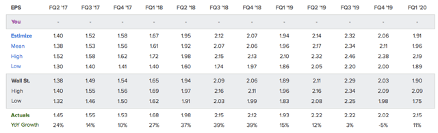 Commençons par examiner rapidement les bénéfices par action de la société. Après être entré en contraction au dernier trimestre 2019 en raison d’une croissance économique plus faible, la société a évité un deuxième trimestre consécutif de contraction, le bénéfice par action ayant augmenté de 11 % pour atteindre 2,15 dollars. Il s’agit non seulement du taux de croissance le plus élevé depuis le deuxième trimestre de 2019, mais aussi d’un taux supérieur de 0,25 $ ou 13,1 % aux attentes.