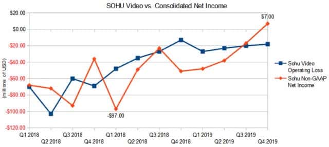 Comme le montre le graphique, le revenu net consolidé de la Sohu reflète les pertes d’exploitation de la Sohu Video au cours des dernières années. Ce n’est qu’après un contrôle budgétaire rigoureux que la société a pu réduire ses pertes trimestrielles de Sohu Video à -18 millions de dollars au quatrième trimestre 2019, ce qui s’est traduit par un bénéfice net consolidé non conforme aux GAAP de 7 millions de dollars pour le trimestre. La dernière fois que la Sohu a enregistré un bénéfice net trimestriel non-GAAP, c’était au troisième trimestre de 2015.