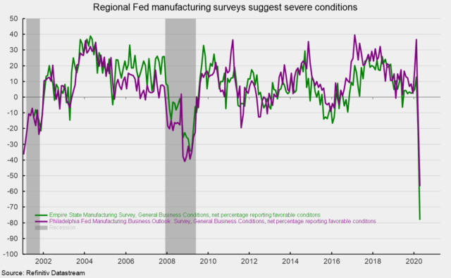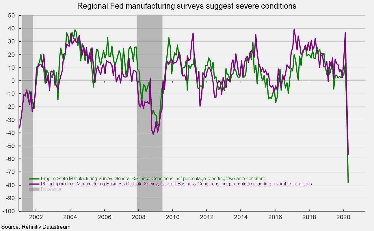 L’enquête Empire State Manufacturing Survey de la Réserve fédérale de New York montre que les conditions générales des affaires se sont à nouveau fortement détériorées en avril, l’indice affichant une baisse record de 56,7 points pour atteindre -78,2 % contre -21,5 % en mars. C’est le résultat le plus bas jamais enregistré depuis le début de l’enquête en 2001 (voir graphique).
