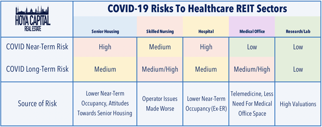 Les soins de santé : Immobilier universel de santé (UHT) a fait un bond de 9,9 % sur la semaine après avoir publié de solides résultats, mais en notant que « le nombre de patients dans nos trois hôpitaux de soins actifs … a été considérablement réduit au cours de la deuxième moitié de mars et a continué en avril », un contraste frappant avec le discours dominant des médias selon lequel les hôpitaux sont pleins et surchargés de patients COVID. Opérateur de l’hôpital Propriétés médicales (MPW) a commenté de la même manière : « Nous avons eu beaucoup de capacité hospitalière qui est restée en attente des patients COVID-19 qui ne se sont pas matérialisés de manière très importante. Nous avons également entendu les commentaires de la société REIT (Lab-space healthcare REIT) Immobilier Alexandrie (ARE) qui a terminé en hausse de 1 % après avoir annoncé de solides résultats, en précisant qu’elle a perçu 98,4 % des loyers d’avril 2020 et des recouvrements de locataires. L’ARE a légèrement réduit ses prévisions en matière de FFO et de NOI des magasins comparables. Nous notons ci-dessous comment les effets de la pandémie seront ressentis avec une intensité différente dans chaque sous-secteur de l’immobilier de santé.