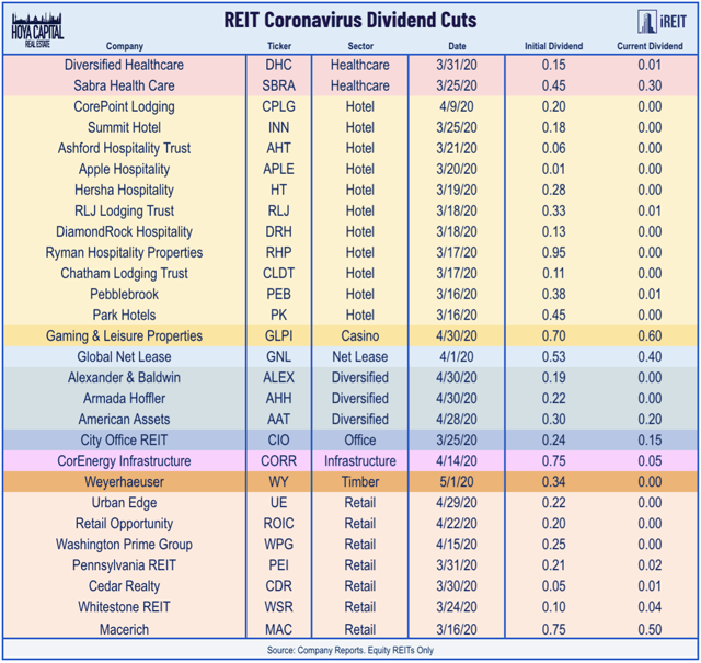 Centre commercial : Les progrès des plans de réouverture économique ont également fait bondir les FPI des centres commerciaux malgré un début de saison des bénéfices mitigé. Valeur au détail (RVI) a terminé la semaine en hausse de 26,0 %, bien qu’elle n’ait perçu que 44 % des loyers de la zone continentale des États-Unis et 36 % des loyers de son portefeuille de Porto Rico, car moins de la moitié de ses locataires sont actuellement ouverts et en activité. Urban Edge (UE) a terminé en hausse de 16,4 % après avoir annoncé qu’elle avait perçu 56 % des loyers d’avril 2020. Alexander & Baldwin (ALEX) a cependant ajouté son nom à la liste croissante des sociétés de placement immobilier pour réduire ou suspendre leur dividende. Nous avons suivi 28 sociétés de placement immobilier dans notre univers de 165 noms pour annoncer une réduction ou une suspension de leurs dividendes, en plus de la moitié environ des sociétés de placement immobilier (20 sur 41) qui ont annoncé des réductions de dividendes jusqu’à présent.