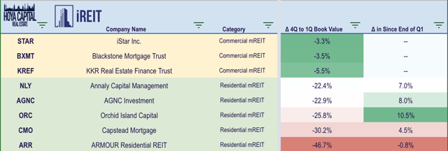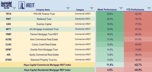 MREITs commerciaux : Les mREITs commerciaux ont gagné 11,6 % après que trois mREITs ont rapporté des résultats. MREITs commerciaux Hypothèque Blackstone (BXMT) et KKR Immobilier (KREF) a lancé la saison des revenus de mREIT avec de solides rapports, terminant la semaine en hausse de 11,6 % et 10,2 %, respectivement. BXMT a indiqué que sa valeur comptable estimée au 3/31 n’a baissé que de 3 % depuis le début de l’année, tandis que le KREF a fait état d’une baisse de 5 %. iStar (STAR) a fait un bond de 25,1 % après avoir annoncé que sa valeur comptable n’avait également baissé que de 3 % au cours du trimestre. Au total, il s’agit de baisses étonnamment minimes si l’on considère que chaque action a baissé de plus de 50 % en cumul annuel à son plus bas niveau au début du mois d’avril. Les MREIT commerciaux restent cependant inférieurs de 42,7% sur l’année.