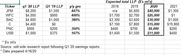 Si vous vous demandez ce qui se passe avec les grandes banques, cette feuille de calcul a été préparée à partir d’un rapport de recherche de vente montrant la croissance attendue des « provisions pour pertes sur prêts » pour les grandes banques en 2020.
