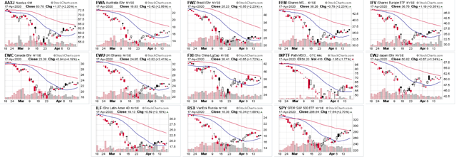 Commençons par les mauvaises nouvelles : l’Inde et la Russie ont été les moins performantes ; l’Amérique latine continue de sous-performer. Du côté positif, l’Asie s’est fortement reprise ; les opérateurs parient que la Chine pourra redémarrer rapidement, ce qui profitera à toute la région. Les marchés émergents et la Chine ont également affiché une meilleure performance. Aucun de ces graphiques n’est assez impressionnant pour être négocié. Bien que tous les indices aient atteint des niveaux bas, tous les graphiques sont encore assez récents.