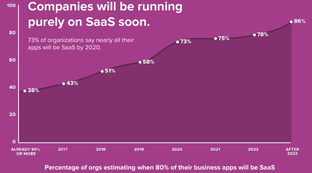 Le portefeuille d’IGV se compose d’environ 104 titres de logiciels. Comme le montre le graphique ci-dessous, le marché mondial du logiciel devrait atteindre 1 000 milliards de dollars d’ici 2030. Ce chiffre sera beaucoup plus élevé que les 550 milliards de dollars actuels en 2019. La croissance du secteur du logiciel est tirée par la tendance au modèle « Software as a Service » (« SaaS »). Pour l’information du lecteur, le SaaS est un modèle commercial qui permet aux entreprises de logiciels de vendre des services au lieu de vendre une licence en une seule fois. Leurs clients auront des coûts initiaux beaucoup plus faibles que l’achat de licences uniques. Ils recevront toujours la dernière version du logiciel. Ces sociétés de logiciels recevront des revenus récurrents prévisibles et stables. Ce modèle commercial connaît un grand succès et a entraîné une augmentation des ventes. La tendance aux services en nuage est également un autre facteur essentiel de l’adoption croissante du SaaS. Comme le montre le graphique ci-dessous, le taux de pénétration du SaaS est passé de 38 % en 2016 à 58 % en 2019. Ce taux de pénétration devrait passer à 86 % après 2022.