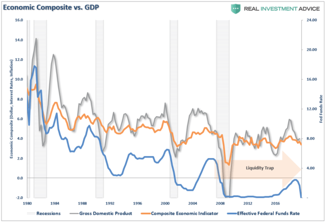 Le graphique ci-dessous est notre indicateur économique composite. Étant donné que les principaux indicateurs de la vigueur économique sont la croissance des salaires, l’inflation, le dollar et les taux d’intérêt, il n’est pas surprenant que l’indicateur soit étroitement corrélé au PIB.