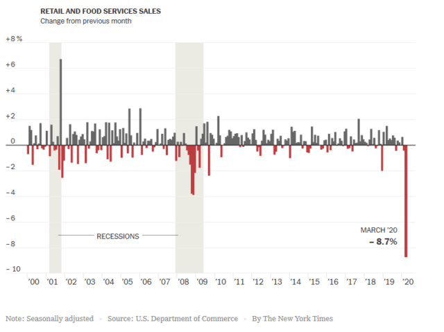 « Un mois assez catastrophique pour les détaillants, et maintenant une course à la survie. Le mois de mars a vu une chute record des ventes, l’épidémie de coronavirus ayant entraîné la fermeture des magasins. Une longue fermeture pourrait entraîner des changements durables dans le paysage commercial ». – NYT