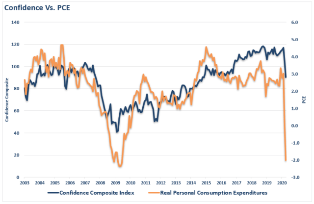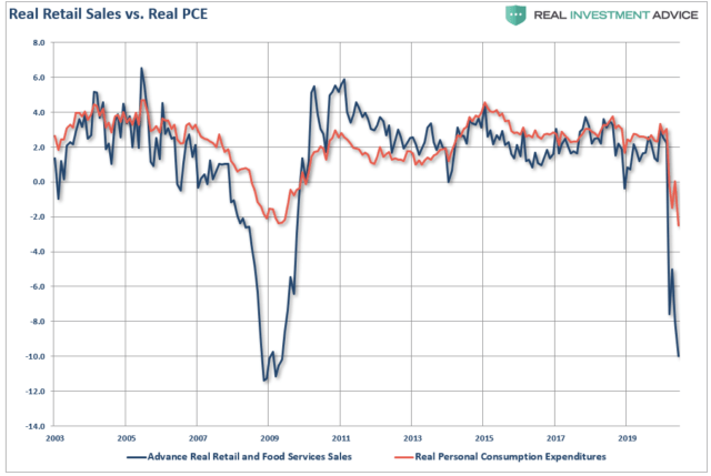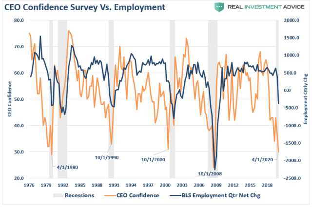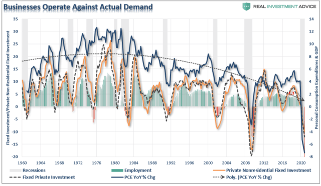 Même si ces entreprises obtiennent des prêts et une assistance, elles ont besoin « recettes » pour rester en activité. Cependant, la méchante « boucle de rétroaction » est qu’en réduisant l’emploi, la consommation est également réduite. À mesure que les recettes diminuent, la propension à investir dans l’économie s’effondre.