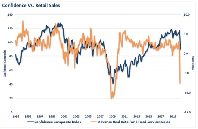 La consommation, c’est-à-dire ce que vous et moi dépensons pour soutenir nos familles, travailler et jouer, représente environ 70 % de la croissance économique. Sur ces 70 %, les ventes au détail représentent environ 40 %. La semaine dernière, le premier « vente au détail ». a été publié, montrant l’impact de la « arrêt économique » sur la consommation intérieure.