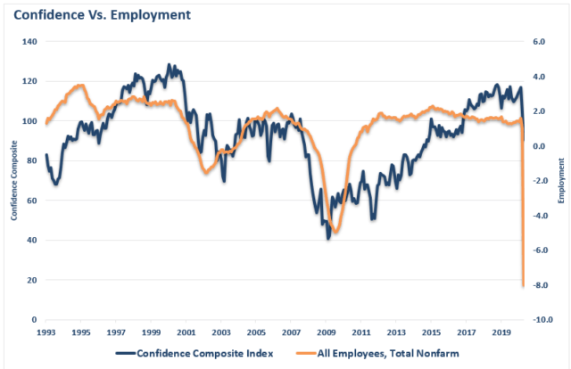 Il est difficile pour les consommateurs de rester « confiants » et de continuer à dépenser lorsqu’ils ont perdu leur source de revenus. C’est pourquoi la confiance des consommateurs ne s’installe pas « doucement dans la nuit », mais plutôt « en criant dans l’abîme ».