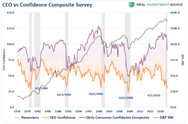 « Remarquez que la confiance des PDG mène de loin la confiance des consommateurs. Cela incite les investisseurs optimistes et les médias à croire que les PDG ne savent pas vraiment ce qu’ils font. Malheureusement, la confiance des consommateurs a tendance à s’effondrer lorsqu’elle rattrape ce que les PDG leur disaient déjà.