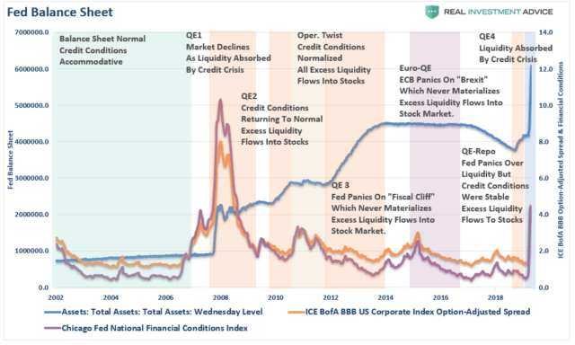 Pour les investisseurs, chaque cycle de « Assouplissement quantitatif était le « stimulus neutre, » qui a été suivie par la « puissant stimulant de la hausse des prix des actions. Il n’est pas surprenant qu’après une décennie de « sonnerie de cloche, » les investisseurs ont été conditionnés à réagir en conséquence.