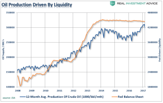 En 2016, lorsque j’ai commencé à discuter des problèmes futurs découlant de la « offre excédentaire » de pétrole, j’ai noté la relation entre le crédit bon marché et la production de pétrole. A savoir :
