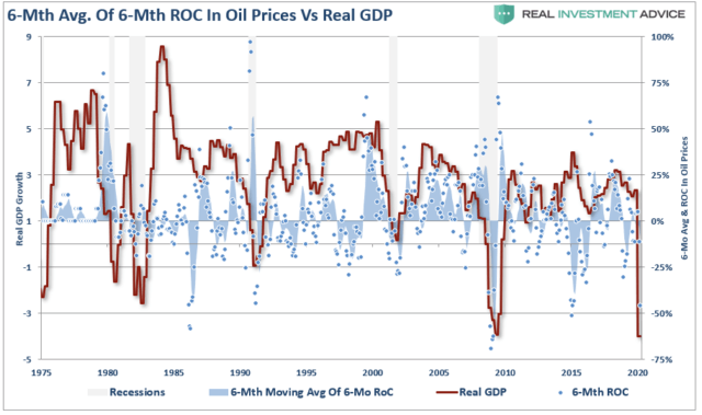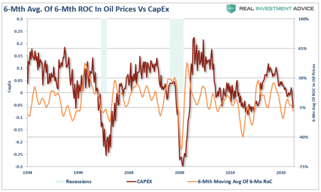 Étant donné que l’industrie pétrolière est très manufacturière et à forte intensité de production, les ruptures de tendance des prix ont tendance à être des événements de liquidation qui nuisent à la fois à la fabrication et aux dépenses de CapEx dans le calcul du PIB. Le graphique ci-dessous montre la moyenne sur six mois du taux de variation des prix du pétrole par rapport aux dépenses en capital dans l’économie. (J’ai utilisé les premières estimations du PIB du premier trimestre pour montrer la baisse coïncidente).