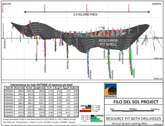 Le 20 avril, Filo Mining (OTCPK:OTCPK:FLMMF) a publié un nouveau lot de résultats du programme de forage 2019/2020 sur le projet Filo del Sol et la meilleure interception a été de 1 009m à 0,57% Cu, 0,39g/t Au et 11,1g/t Ag à partir de 132m dans le trou FSDH032. Ceci est égal à 937(AuEq.)m et cette Le trou s’est terminé par une minéralisation. Le FSDH032 sort de la coquille de la fosse qui définit la ressource actuelle à 378m, ce qui signifie que tout ce qui se trouve en dessous de cette profondeur est en dehors de la ressource.
