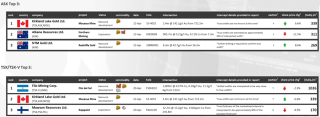 Le 22 avril, Kirkland Lake Gold (KL) a publié les résultats de 19 trous de forage d’exploration souterraine et de 15 trous de forage antérieurs et réinterprétés dans sa mine Macassa. La meilleure interception a été de 2,4 m à 141,1g/t Au à partir de 722,2 m dans le trou 53-4052, ce qui équivaut à 339(AuEq.)m.