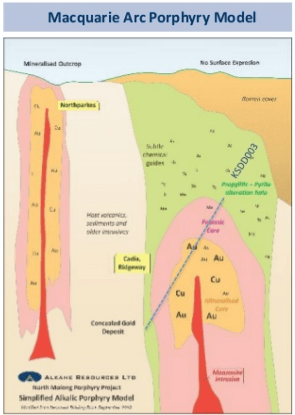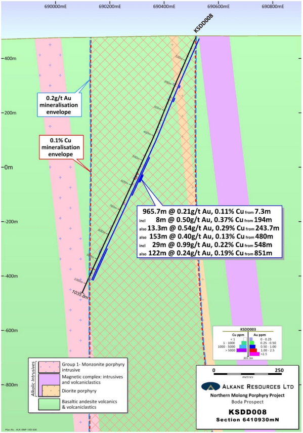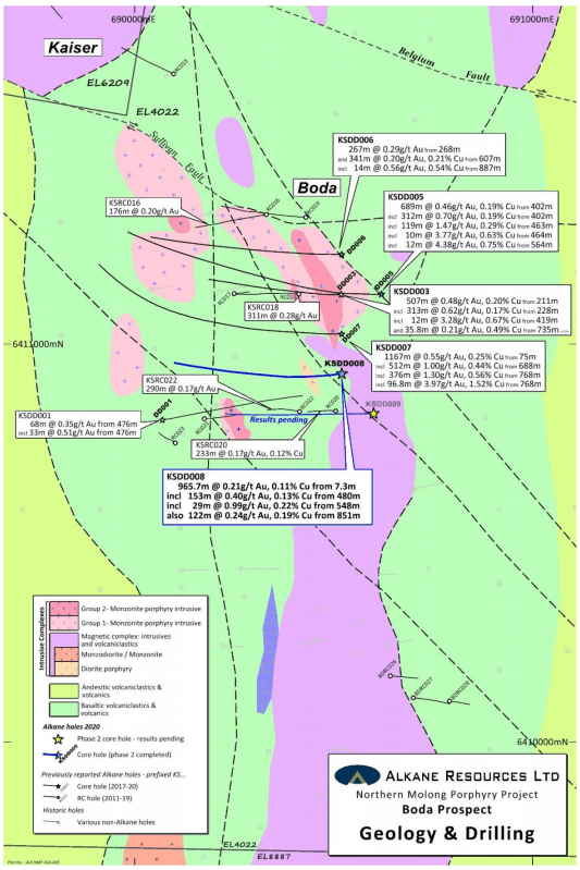 Le 22 avril, Alkane Resources (OTCQX:OTCQX:ALKEF ; OTCQX:OTCQX:ANLKY) a annoncé avoir recoupé une importante minéralisation porphyrique d’or et de cuivre sur le prospect Boda de son projet Molong. Le meilleur résultat de forage a été de 965,7m à 0,22g/t Au et 0,11% Cu à partir de 7,3m dans le trou KSDD808, ce qui équivaut à 311(AuEq.)m. Ce trou a également recoupé plusieurs zones de minéralisation internes significatives.
