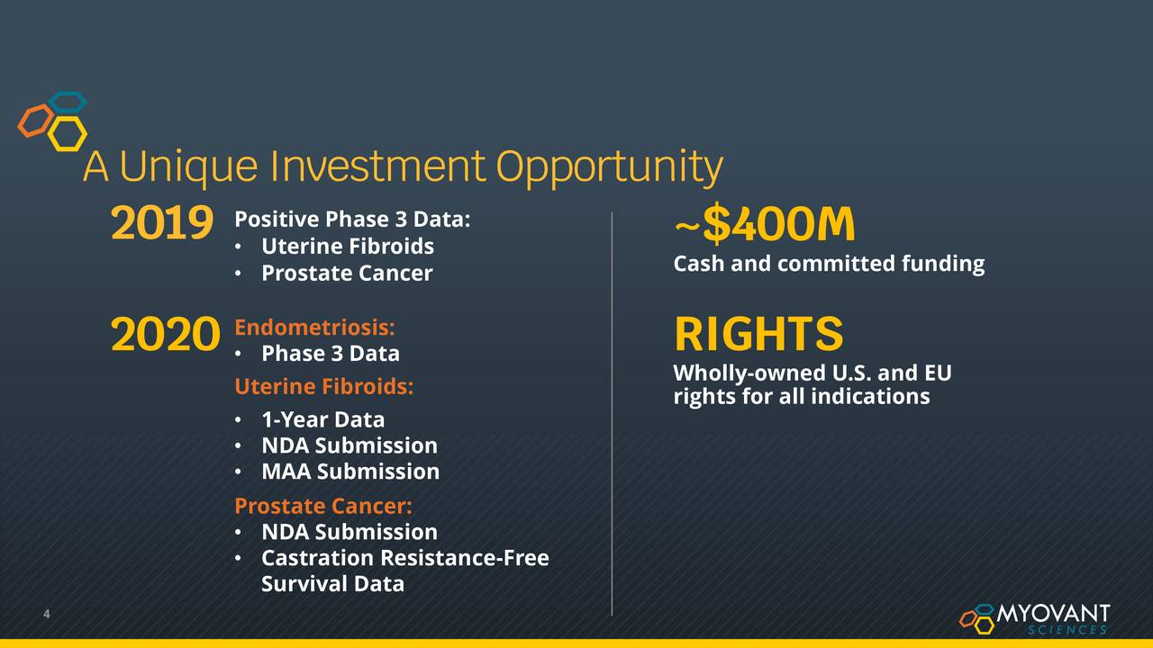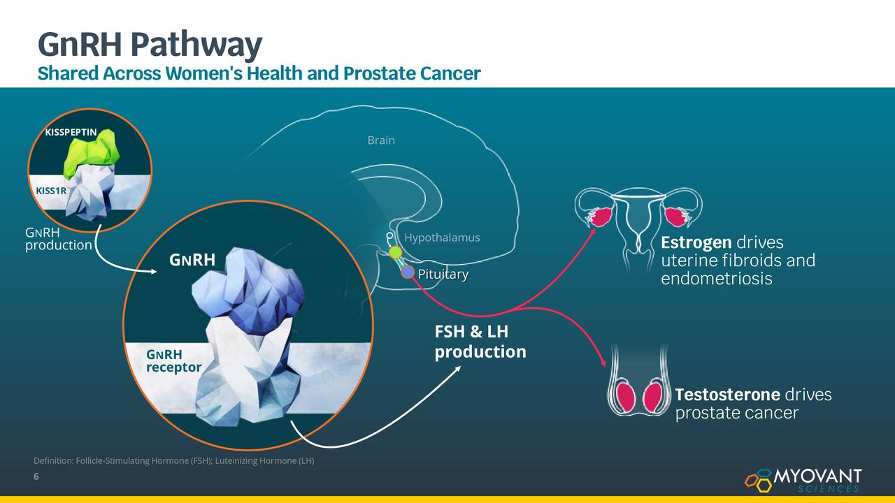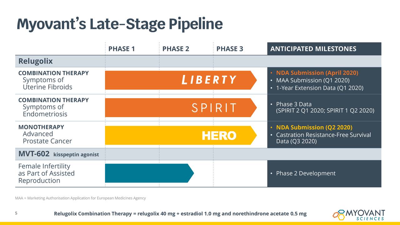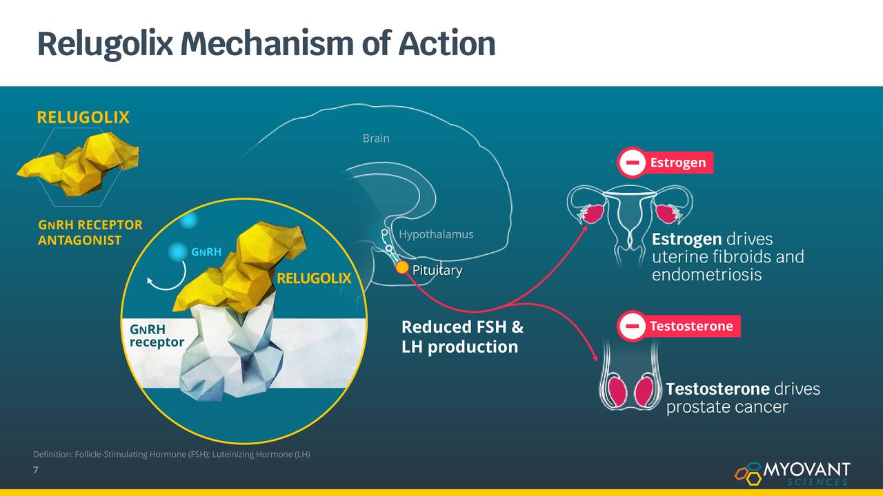 Les espoirs de la société reposent sur le relugolix, un antagoniste direct de l’hormone de libération de la gonadotrophine (GnRH) déjà approuvé au Japon en monothérapie pour le traitement des hémorragies dues aux fibromes utérins. (En échange de redevances élevées à un chiffre, Myovant a concédé sous licence les droits commerciaux du relugolix en dehors de l’Asie à Takeda Pharmaceutical (TAK) en 2016). L’inhibition des récepteurs de la GnRH diminue la libération de gonadotrophines, et donc la production d’œstrogènes et de progestérone par les ovaires et de testostérone par les testicules. Myovant développe le relugolix sous forme de comprimé combiné à prise unique quotidienne (avec de l’oestradiol et de l’acétate de noréthindrone) pour le traitement des saignements menstruels abondants associés aux fibromes utérins et pour la douleur associée à l’endométriose. Elle fait également progresser la monothérapie par relugolix comme traitement pour les hommes atteints d’un cancer avancé de la prostate sensible aux androgènes.
