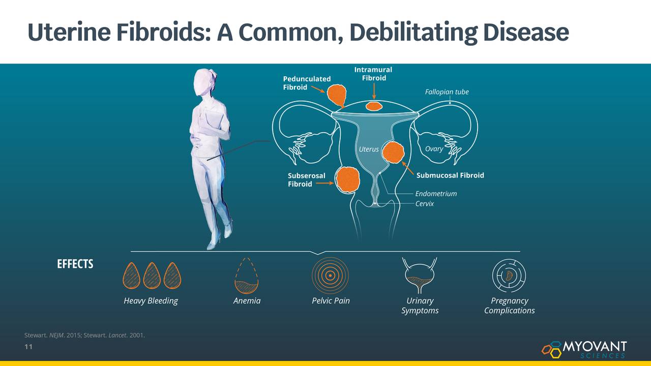 Hémorragie associée aux fibromes utérins. La société a mené deux essais de phase 3 (LIBERTY 1 et 2) pour évaluer le comprimé combiné relugolix dans le traitement des saignements associés aux fibromes utérins. Lors d’une lecture de LIBERTY 1 en mai 2019, le traitement de Myovant a atteint son critère d’évaluation principal avec 73,4% des femmes (n=388) démontrant un volume de perte sanguine inférieur à 80 ml contre 18,9% recevant un placebo (p < 0,0001). En moyenne, une réduction de 84,3 % des pertes sanguines menstruelles par rapport au point de départ a été obtenue. La thérapie combinée a permis de maintenir des densités minérales osseuses comparables à celles du placebo. Ces résultats ont été essentiellement répétés dans LIBERTY 2, (n=382 ; 71,2 % contre 14,7 % (p < 0,0001) ; 84,3 % de réduction par rapport à la ligne de base), qui a été lu en juillet 2019. Ces succès ont été suivis par une étude d'extension ouverte, dont les données ont été publiées le 10 février 2020, validant encore l'efficacité de la thérapie combinée avec une réduction moyenne de 89,9 % des pertes sanguines menstruelles par rapport à la ligne de base à un an.