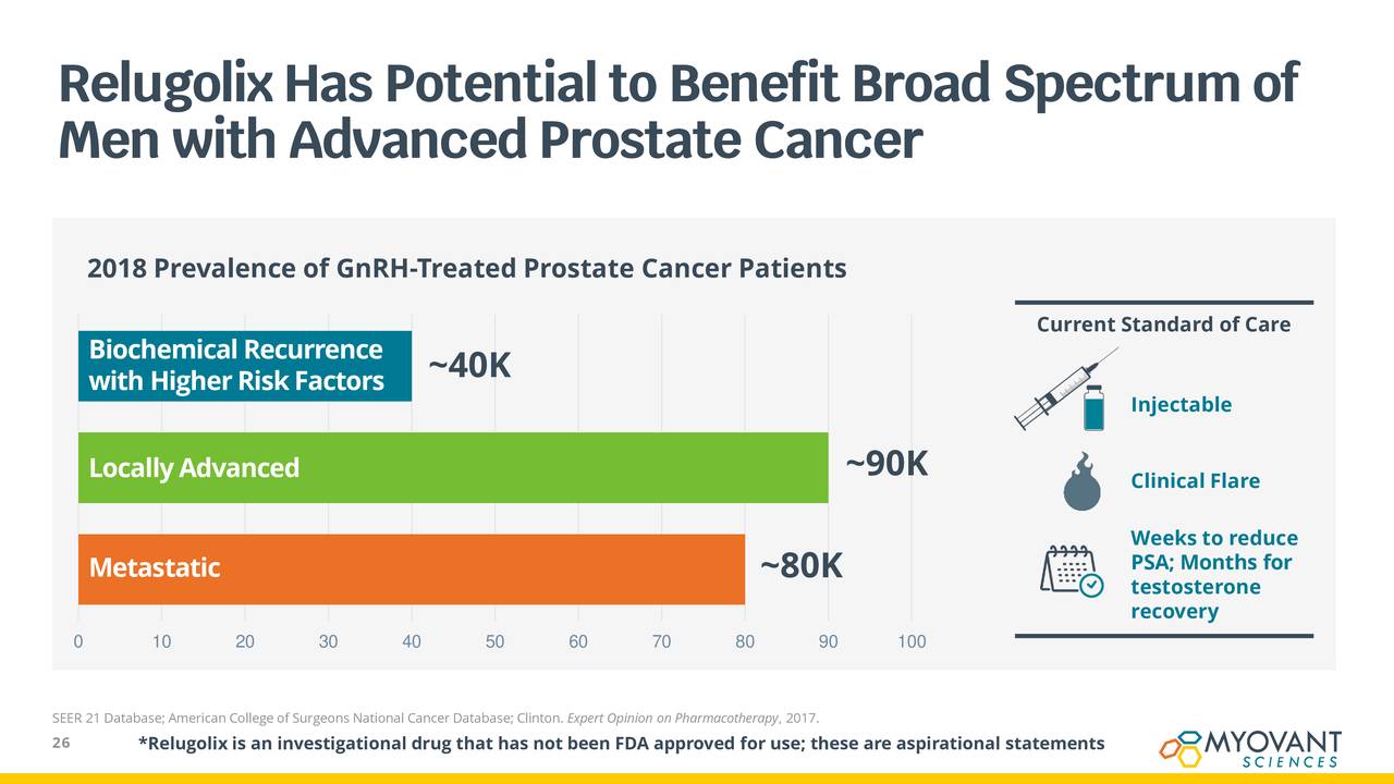Cancer de la prostate sensible aux androgènes. Myovant conserve les droits commerciaux aux États-Unis et pour d’autres indications en dehors de la santé des femmes, y compris le cancer de la prostate sensible aux androgènes, une indication qui n’est pas actuellement poursuivie par AbbVie. Dans un essai de phase 3 « HERO » évaluant le relugolix en monothérapie dans le traitement de 934 patients atteints d’un cancer avancé de la prostate nécessitant une thérapie de privation d’androgène (ADT), qui a été lu le 19 novembre 2019, le candidat de Myovant s’est montré très prometteur, atteignant son objectif principal avec un taux de réponse de 96,7% (c’est-à-dire qu’il a obtenu une suppression soutenue de la testostérone aux niveaux de castration) tout en démontrant 54% de moins d’événements cardiovasculaires majeurs par rapport au leuprolide, un comparateur standard de soins. À noter également : en moyenne, les niveaux de testostérone sont revenus à la normale en 90 jours, soit beaucoup plus rapidement que le leuprolide. Sur la base de ces résultats, Myovant déposée une NDA pour cette indication le 21 avril.