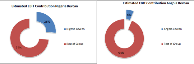 D’un point de vue opérationnel, les marges en Angola et au Nigeria ont été assez élevées. Bien qu’elles ne soient pas divulguées directement, certaines estimations permettent de les infirmer grossièrement. Pour le Nigeria, les marges opérationnelles sont d’environ 25 %, tandis que pour l’Angola, elles sont d’environ 16 %, après avoir chuté à partir de l’exercice 2018 où elles étaient également supérieures à 20 %. En comparaison, la marge d’exploitation sur le marché sud-africain plus mature des bevcans est d’environ 14 %. Les marges peuvent évoluer sensiblement dans un sens ou dans l’autre dans le reste de l’Afrique, et avec la contribution de ces deux opérations du reste de l’Afrique à l’EBIT du groupe à ~32%, l’impact d’une diminution des marges sur les flux de trésorerie et le bilan peut être sévère, ce dont il faut tenir compte lorsque le bilan est dans une position aussi précaire.