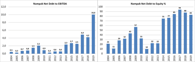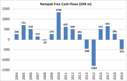 À partir de la dernière série de résultats (exercice 2019), le ratio dette nette/EBITDA de Nampak a été multiplié par 10. L’EBITDA a été affecté par des éléments anormaux pour un montant de 1,3 milliard de ZAR (principalement des pertes de change subies sur les opérations au Zimbabwe). Sans ces éléments, le ratio dette nette/EBITDA aurait été de 3,2 fois (contre 2,5 fois pour l’année précédente sur une base comparable). C’est l’un des problèmes que pose l’analyse de Nampak. Le compte de résultat est toujours fortement influencé par des éléments « anormaux », de sorte que les éléments anormaux sont si fréquents que je préfère les inclure, car la plupart des éléments anormaux ont des implications sur les flux de trésorerie. D’un point de vue purement bilantaire, la dette nette de 6,6 milliards ZAR est en hausse de 7 % par rapport à l’année précédente et représente 83 % des fonds propres du groupe, soit 542 % de la capitalisation boursière. Le groupe a enfreint des clauses et a dû négocier un assouplissement des clauses avec les détenteurs de la dette, qui est passé de 3,0 fois la dette nette à 3,5 fois l’EBITDA (ce qui exclut les éléments anormaux du calcul).