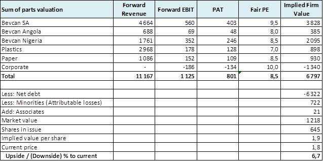 La somme des parties montre que ce qui compte vraiment dans ce secteur en ce moment, c’est l’endettement. La position de la dette nette un an après est un chiffre presque impossible à prévoir, elle sera fortement influencée par les mouvements opérationnels et plus encore par les mouvements de change. ~75% de la dette brute de Nampak est libellée en dollars. Pour l’année fiscale 2019, le ZAR USD s’est négocié dans une fourchette de 12 à 15 ZAR pour le dollar. Pour l’année fiscale 2020, le ZAR a atteint 19 ZAR pour un dollar, ce qui représente une dépréciation d’environ 35 % pour le ZAR. Cela implique une augmentation de la dette brute d’environ 35 % pour 75 % de la dette totale de Nampak, ou une augmentation de 6 à 8 milliards de ZAR si cette dépréciation se poursuit pendant le reste de l’année, c’est-à-dire que la totalité du produit de la cession de l’activité « verre, cartons et plastiques » au Royaume-Uni (1,9 milliard de ZAR) pourrait être engloutie par la seule dépréciation de la monnaie, car ce produit ne sera affecté à la réduction de la dette en USD qu’au cours du second semestre de l’exercice financier. La somme des parties montre une légère hausse, mais ma conviction dans la valorisation de cette activité est faible, et c’est vraiment un résultat binaire maintenant pour Nampak avec des risques biaisés à la baisse à mon avis (c’est-à-dire une émission de droits très dilutive probable).