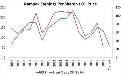 Au début de l’année, Nampak était sur la voie de la reprise. Un changement de PDG, ainsi qu’un certain nombre de ventes d’actifs, auraient pu régler les problèmes de bilan et extraire une certaine valeur des principaux actifs du groupe, les opérations de bevcan. Malheureusement, l’effondrement du prix du pétrole fera apparaître de nouveaux problèmes. Compte tenu des opérations en Angola et au Nigeria, pays fortement dépendants du pétrole, les revenus de Nampak sont en corrélation avec le prix du pétrole.