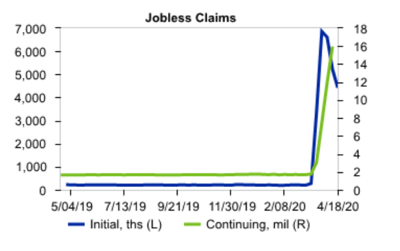 Les demandes initiales restent extraordinairement élevées en raison de la COVID-19. Les demandes initiales de prestations d’assurance chômage aux États-Unis se sont élevées à 4,427 millions pour la semaine se terminant le 18 avril, soit une baisse de 810 000 par rapport à la semaine précédente. La moyenne mobile sur quatre semaines a augmenté de 280 000 pour atteindre 5,787 millions.