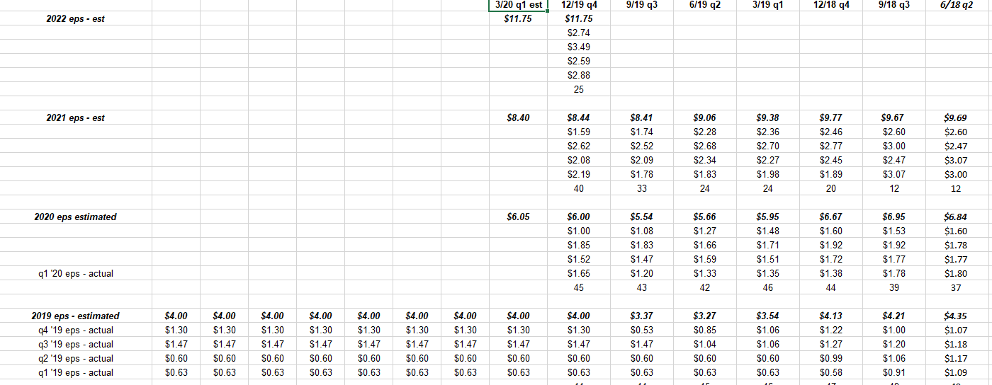 Les estimations sous « 3/20 T1 – est » sont le consensus actuel du BPA tel que détaillé par IBES par Refinitiv au 17/4/20.