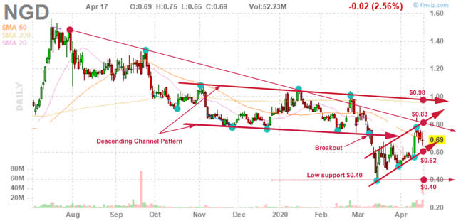 Le NGD a connu une rupture de soutien de son ancien modèle de canal descendant début mars et est rapidement tombé à $0.40, qui est maintenant un soutien. Le nouveau modèle est appelé un canal ascendant avec une résistance de ligne à $0.83 et le soutien en ligne à $0.62.