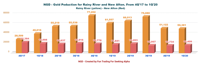 Vous trouverez ci-dessous la production d’or trimestrielle des deux mines depuis le quatrième trimestre de 2007. La société a indiqué que le Mine de Rainy River produit 51,106 GEO (50 381 onces d’or et 61 265 onces d’argent) pour le premier trimestre. Cependant, la période comprenait 12 jours de la suspension temporaire de 14 jours des opérations annoncée le 20 mars 2020. Les opérations ont repris le 3 avril 2020 et seront progressivement intensifiées.
