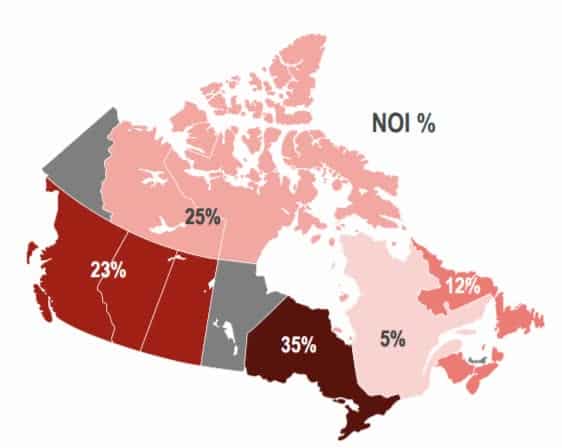 Leur portefeuille comprend environ 27 000 unités résidentielles et 1,2 million de pieds carrés d’espace commercial sur plus de 60 marchés dans huit provinces et deux territoires, avec une forte exposition à l’Ouest et au Nord du Canada ainsi qu’à l’Ontario. Vous pouvez trouver plus de détails sur leur exposition géographique en regardant cette carte qui explique le pourcentage du revenu net d’exploitation par région.