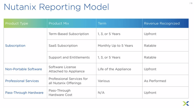 Cependant, nous devons faire une mise en garde. La définition du terme « abonnement » donnée par Nutanix peut être un peu trompeuse, car certains des revenus qu’elle qualifie d’abonnement sont en fait reconnus d’emblée et non au prorata de la durée du contrat. Comme le montre le tableau ci-dessous, les abonnements à durée déterminée (y compris l’abonnement populaire de trois ans de Nutanix) sont traités comme des revenus initiaux, alors que les abonnements SaaS sont reconnus de manière proportionnelle, comme c’est le cas pour les autres sociétés de logiciels.