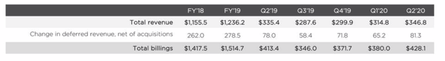 Rappelons que l’année fiscale 20 est une grande année pour Nutanix qui doit prouver qu’elle peut renouer avec la croissance de la facturation. Au premier trimestre, les facturations de Nutanix ont diminué de 1 % par an, mais plus récemment, au deuxième trimestre, qui se termine en janvier, elles ont augmenté de 4 % par an, ce qui est un signe positif de reprise pour cette année :