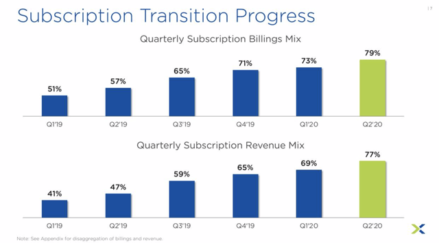 Nous avons toutefois un facteur de consolation, à savoir le fait que Nutanix a augmenté le pourcentage de ses abonnements par rapport au total des recettes et des facturations. Depuis le deuxième trimestre, les facturations d’abonnements et la répartition des revenus de Nutanix ont atteint des niveaux record de 79 % et 77 %, respectivement :