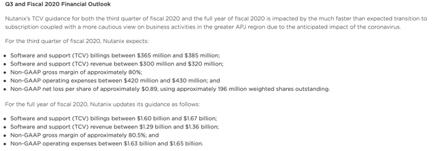 Notez que les orientations de Nutanix pour 2020 prévoient dès à présent une accélération au cours du second semestre 2020, tant en termes de recettes que de facturation, qui ont augmenté au premier semestre 2020 de 2 % et 1 % respectivement. À l’époque, cependant, Nutanix n’avait compris les effets du coronavirus sur la demande qu’en Asie. Le directeur financier Duston Williams, en discutant des hypothèses d’orientation sur l’appel des gains du deuxième trimestre, a noté ce qui suit :