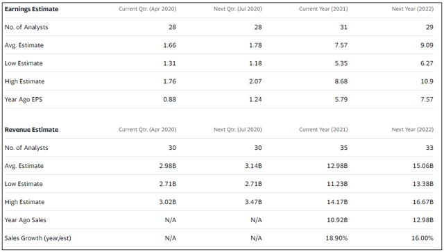 Dans le graphique ci-dessous, vous pouvez voir où en étaient les estimations à la fin de la semaine dernière. Comme il manque à Yahoo certains chiffres, les voici : il y a un an, pour la période d’avril 2020, le montant serait de 2,22 milliards de dollars (soit une croissance d’environ 34 % pour l’estimation de cette année), et pour la période de juillet 2020, le montant est de 2,58 milliards de dollars (soit une croissance d’environ 22 % d’une année sur l’autre). Comme point de référence, l’exercice fiscal actuel de Nvidia se terminera en janvier 2021, il ne s’agit donc pas d’une société qui se trouve dans le cycle de reporting typique du calendrier.