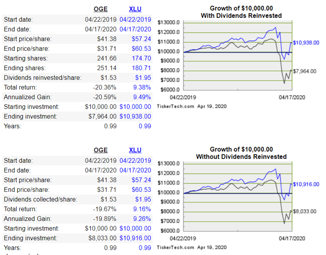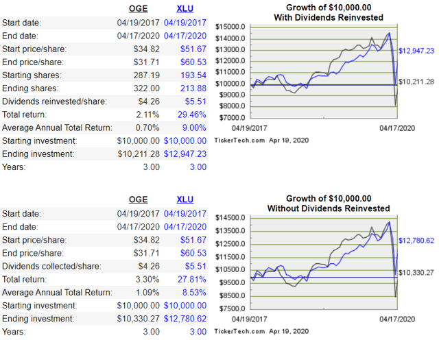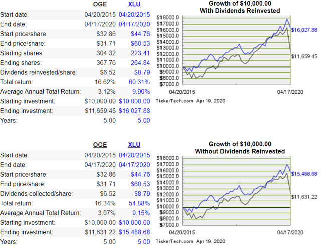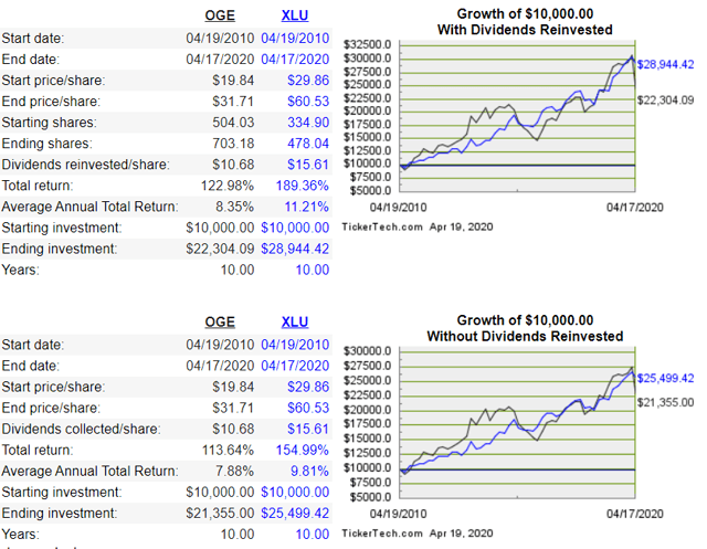 Au cours des 10 dernières années, les rendements des OGE ont été inférieurs à ceux de l’indice S&P Utility (XLU) – quelles que soient les périodes choisies. Les graphiques ci-dessous, fournis par dividendchannel.com, racontent certainement une triste histoire pour la plupart des investisseurs d’OGE depuis 2010.