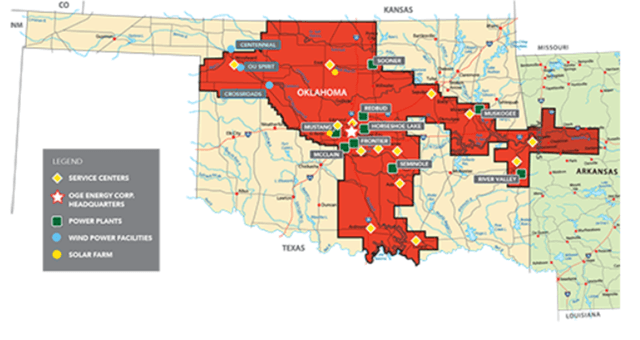 OGE dessert 860 000 clients et exploite une capacité de production de 7 081 mégawatts. Les clients sont répartis comme suit : 33% pour les services résidentiels, 27% pour les services commerciaux, 13% pour les services industriels, 12% pour les champs pétrolifères et 11% pour l’éclairage public. Tout en générant un peu plus de la moitié de ses besoins internes, en 2019, sa répartition par combustible était la suivante : 72 % de gaz naturel (chaudière, cycle combiné, cycle simple), 23 % de charbon et 5 % de solaire. Sur les 3,5 milliards de dollars du budget d’expansion des actifs réglementés sur cinq ans, 41 % doivent être consacrés à l’amélioration de la fiabilité et de la résilience de son réseau électrique existant, 35 % aux systèmes de distribution électrique, 12 % à la production d’électricité et 5 % aux lignes de transmission réglementées par la FERC. Vous trouverez ci-dessous une carte de son territoire de service :
