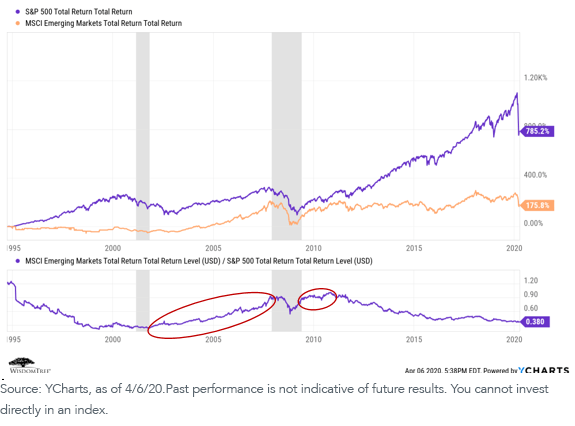 Les marchés émergents constituent un autre domaine potentiel à prendre en considération. Alors que le marché américain a surpassé les marchés émergents sur une base cumulée au cours des 25 dernières années, les marchés émergents ont surpassé les deux derniers régimes de marché en récession (marqués par les barres grises).