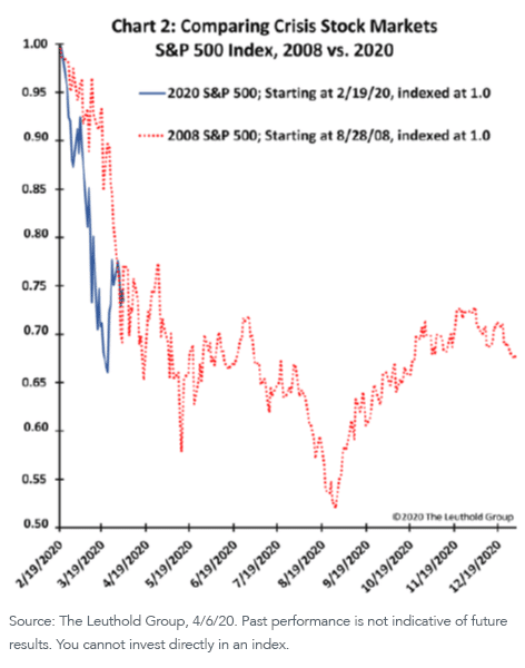 Il ne fait aucun doute que la perturbation actuelle du marché est sans précédent. Elle présente deux caractéristiques uniques : (1) le déclin du marché a été vertigineux dans sa rapidité et son ampleur, et (2) c’est la première récession économique et de marché « auto-induite » de l’histoire. Dans l’intérêt de notre santé et de notre sécurité collectives, nous avons volontairement freiné l’économie mondiale, et le marché a réagi en conséquence.