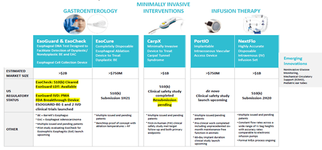 L’entreprise construit un portefeuille de produits complémentaires conçus pour diagnostiquer et traiter les affections de l’œsophage, y compris les affections résultant de brûlures d’estomac chroniques, qui peuvent conduire au cancer de l’œsophage. EsoCheck et EsoGuard sont disponibles sur le marché à partir de la fin décembre 2019, et la société espère commercialiser EsoCure en 2021. Dans son rapport 2020 au Congrès, le National Cancer Institute a souligné que ces appareils constituaient l’une des avancées significatives de l’année en matière de prévention du cancer.