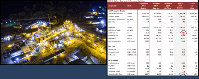 Malheureusement, et comme indiqué plus haut, Edikan a connu un trimestre terrible, ce qui a anéanti une grande partie des progrès réalisés à Sissingue, étant donné qu’Edikan contribue pour plus du double des onces que Sissingue fait à la production consolidée de Persée. Non seulement la production baisse de plus de 20 successivement à Edikan à seulement 38 000 onces, mais les coûts ont également atteint des niveaux astronomiques en raison de cette production inférieure, à 1 242 $/oz. Ce chiffre est supérieur de 20 % au coût du deuxième trimestre fiscal de 1.031 $/oz, bien qu’une petite partie de ce chiffre soit liée à un capital de soutien plus élevé au cours du trimestre. La raison de la faible performance d’Edikan est que la récupération de l’or a chuté au troisième trimestre fiscal, passant de 85,2% au deuxième trimestre fiscal à 61,1% au dernier trimestre. Ces faibles taux de récupération de l’or ont conduit à une baisse de la production de la mine, ce qui a fait baisser ce qui aurait dû être un battement sur les prévisions de 280 000 onces pour l’année fiscale 2020 pour Persée. Cela s’explique par le fait que la production annuelle d’or était en bonne voie pour près de 210 000 onces au cours des neuf premiers mois, mais qu’elle ne s’élève actuellement qu’à 192 000 onces en raison du déficit d’Edikan.