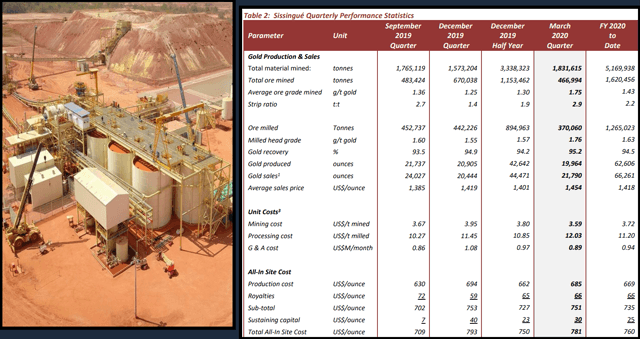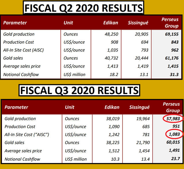 En commençant par la mine Sissingue de la société, Perseus a connu un trimestre solide, avec une production d’or de 20 000 onces au total, pour un coût de maintien de 71 dollars l’once. Cela a porté la production d’or pour les neuf premiers mois à un total de 62 600 onces, ce qui est en bonne voie pour battre la production d’or de l’année fiscale 2019 de 79 800 onces. En attendant, la récupération de l’or reste forte à la mine, se situant à 94,5 % pour les neuf premiers mois, ce qui est aussi à peu près conforme aux taux de récupération de l’or de l’année fiscale 2019 de 95,0 %. Par conséquent, l’entreprise a fonctionné presque sans faille à Sissingue, surtout si l’on considère les défis sans précédent auxquels les entreprises sont confrontées dans tous les secteurs, compte tenu des perturbations et des arrêts de la chaîne d’approvisionnement liés à la COVID-19. Pour l’année fiscale 2020, il semble que Persée ne devrait pas avoir de problème à atteindre une production de 80 000 onces d’or au total, avec des coûts de maintien en dessous de 775 $/oz.